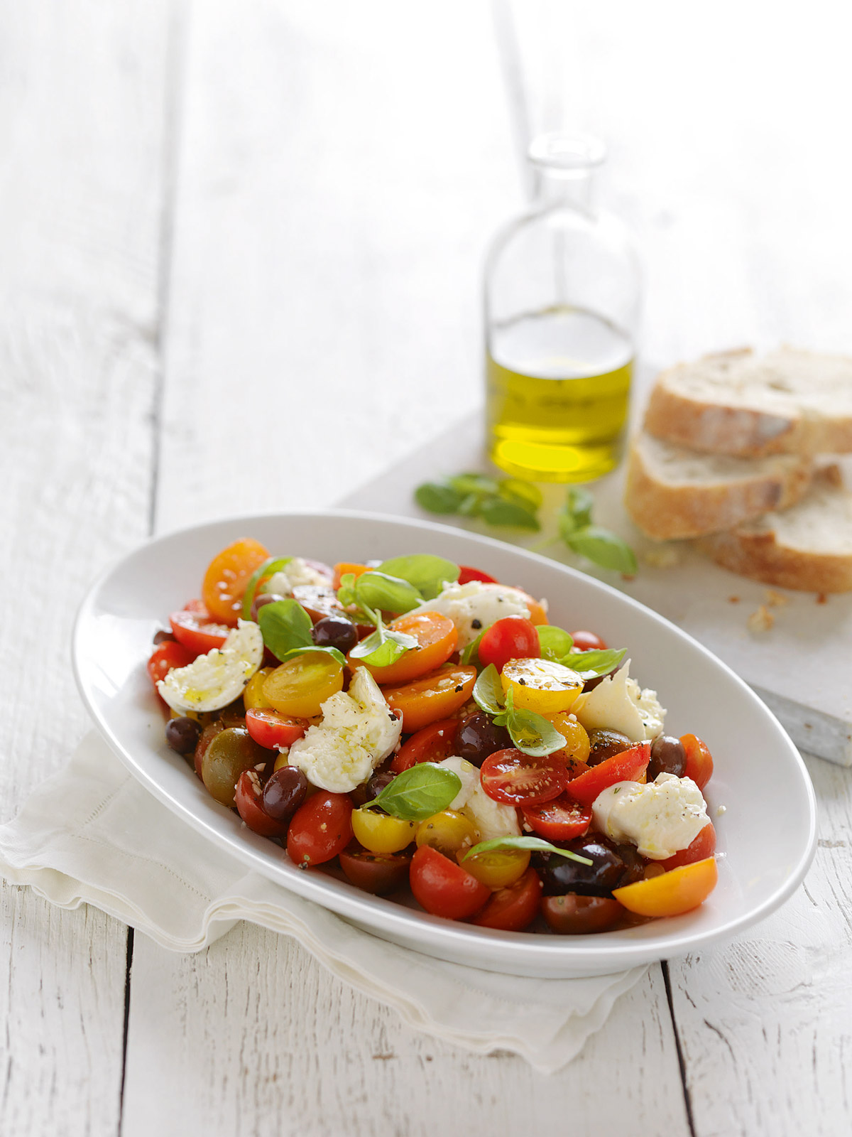 Toss torn basil leaves with tomato wedges and halved baby bocconcini. Drizzle with extra virgin olive oil and season with sea salt and black pepper. Serve with grilled ciabatta bread.