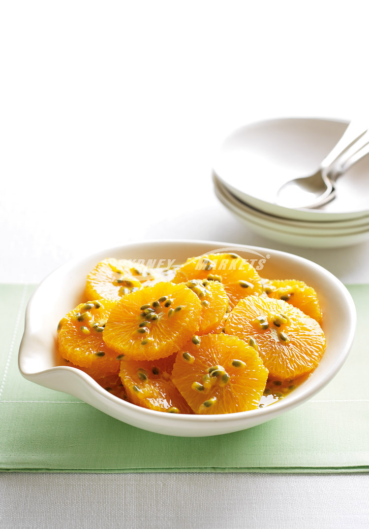 Step 2 Using a sharp knife, peel, remove white pith and slice remaining 5 oranges into rounds. Place in a medium bowl. Pour cooled passionfruit syrup over oranges. Gently toss to combine. Cover and refrigerate until chilled and serve.